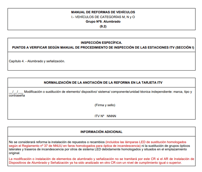 “No se considerará reforma la instalación de repuestos o recambios (incluidos las lámparas LED de sustitución homologados según el Reglamento nº 37 de NNUU en faros homologados para óptica de incandescencia) ni la sustitución de grupos ópticos laterales y traseros de incandescencia por otros de sistema LED debidamente homologados y situados en el emplazamiento original”.