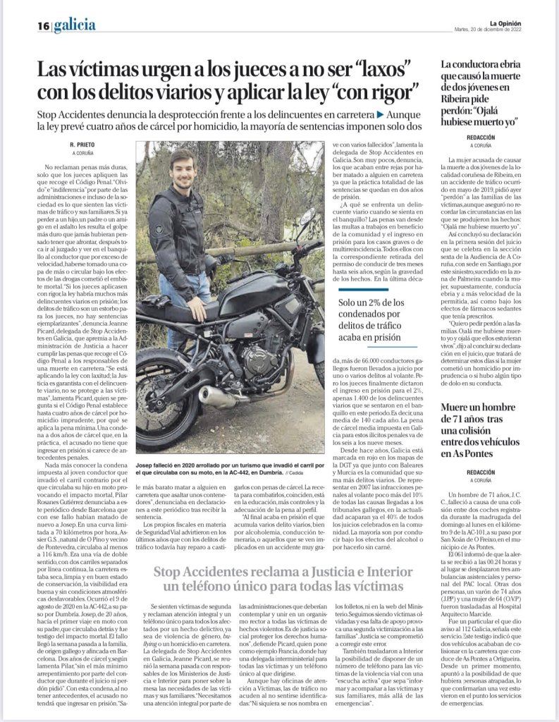 Prieto, R. 20 diciembre 2022. Las víctimas urgen a los jueces a no ser tan «laxos» con los delitos viarios y aplicar la ley «con rigor». Faro de Vigo.